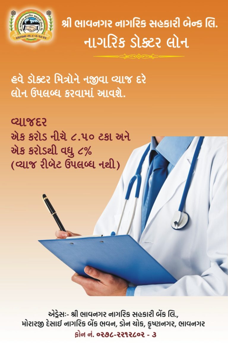 શ્રી ભાવનગર નાગરિક સહકારી બેંક લિ. દ્વારા ડોક્ટર મિત્રો માટે ખાસ લોન યોજના રજૂ કરવામાં આવી છે, જેને “નાગરિક ડોક્ટર લોન” નામ આપવામાં આવ્યું છે. આ યોજના હેઠળ ડોક્ટરો માટે હવે લોન ઓછા વ્યાજદરે ઉપલબ્ધ બનાવવામાં આવી છે જેથી તેઓ તેમના વ્યવસાયને વિસ્તૃત કરી શકે, નવી મેડિકલ સાધનો ખરીદી શકે, ક્લિનિક કે હોસ્પિટલ માટે જરૂરિયાત મુજબનું નવું ઇન્ફ્રાસ્ટ્રક્ચર ઉભું કરી શકે. આ લોન યોજનાના આધારે, જો લોનની રકમ એક કરોડ રૂપિયા સુધી હોય તો તેનો વ્યાજદર 8.50% રહેશે, અને જો લોન એક કરોડ રૂપિયા કરતા વધુ હોય તો વ્યાજદર 9% રહેશે. ખાસ નોંધનીય છે કે, આ યોજના હેઠળ કોઈ પણ પ્રકારનો વ્યાજ રિબેટ ઉપલબ્ધ નથી.