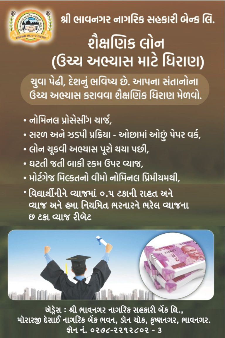 શૈક્ષણિક લોન (ઉચ્ચ અભ્યાસ માટે ધિરાણ) – શ્રી ભાવનગર નાગરિક સહકારી બેંક લિ.